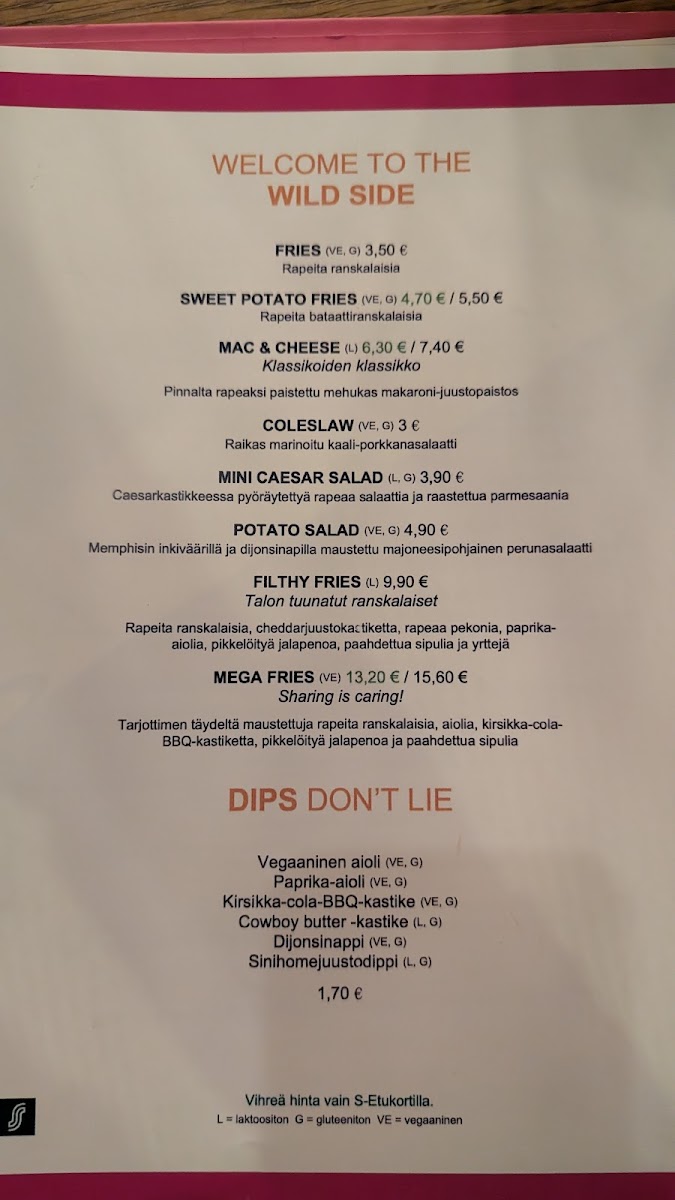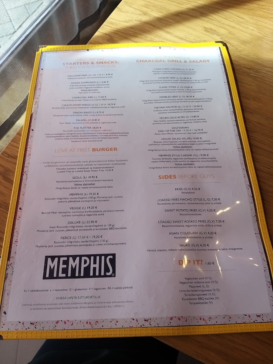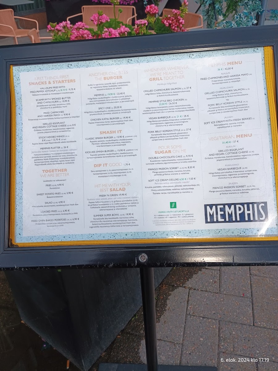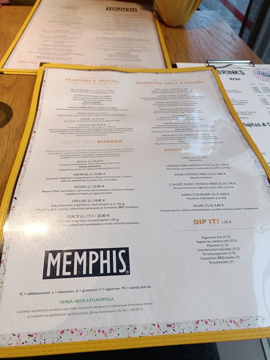Memphis Hakaniemi offers a diverse and satisfying menu, perfect for a casual yet flavorful dining experience. Starting with appetizers, their The Snack Platter comes in various portions, with options for 4 pieces (€18) or 6 pieces, featuring a delicious assortment of bites. For something lighter, their Halloumi Fries are a popular choice. Moving on to the main courses, the burgers steal the show. The Halloumi Burger is a vegetarian favorite, while the Memphis Burger and Beef & Bacon Sandwich cater to those craving something meatier. If you're looking for something from the grill, the Grilled Creamy Chicken and Cajun Salmon are standout dishes, and for a unique treat, the Barbeque Cheek & Fries is a must-try. For sides, the Filthy Fries, Sweet Potato Fries, and Potato Salad complement any dish perfectly, while Coleslaw and Fries are simple but satisfying options. If you're craving a salad, options like the Katkarapu (shrimp), Kanan Rinta (chicken breast), and Pariloitu Vuohenjuusto Cobb Salad are sure to please. To enhance your meal, choose from a variety of dips like Sinihomejuusto (blue cheese), Dijon-Sinappi (Dijon mustard), and the spicy Cowboybutter-Kastike. For those who love a bit of heat, the Double Jalapeño Smash and Double Oklahoma Smash from the Smash Burger section are exciting choices. The menu offers a perfect balance of flavors, with something for everyone, whether you're in the mood for burgers, grilled meats, or light salads.