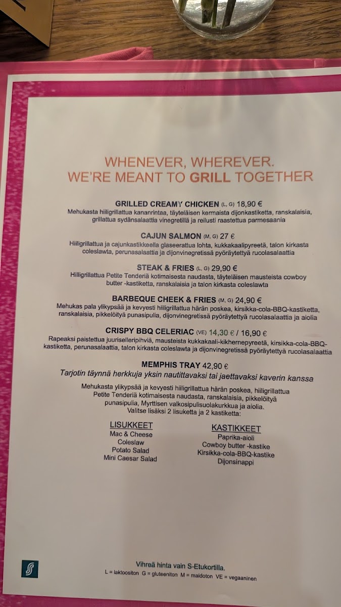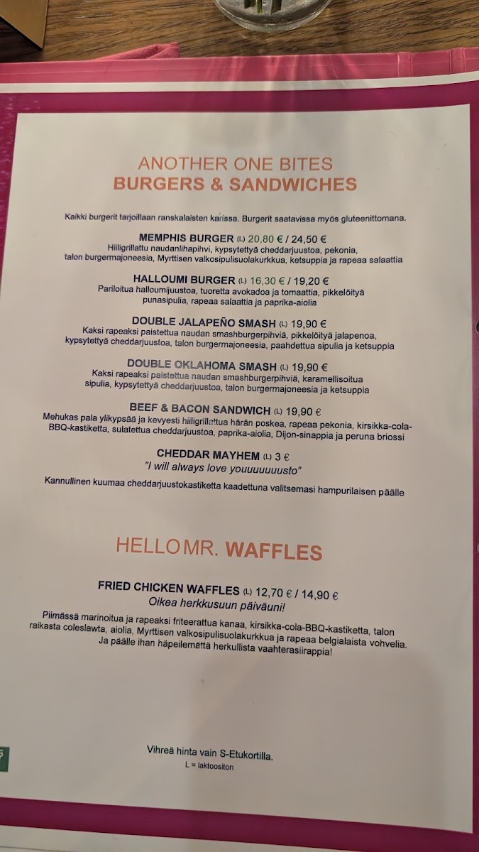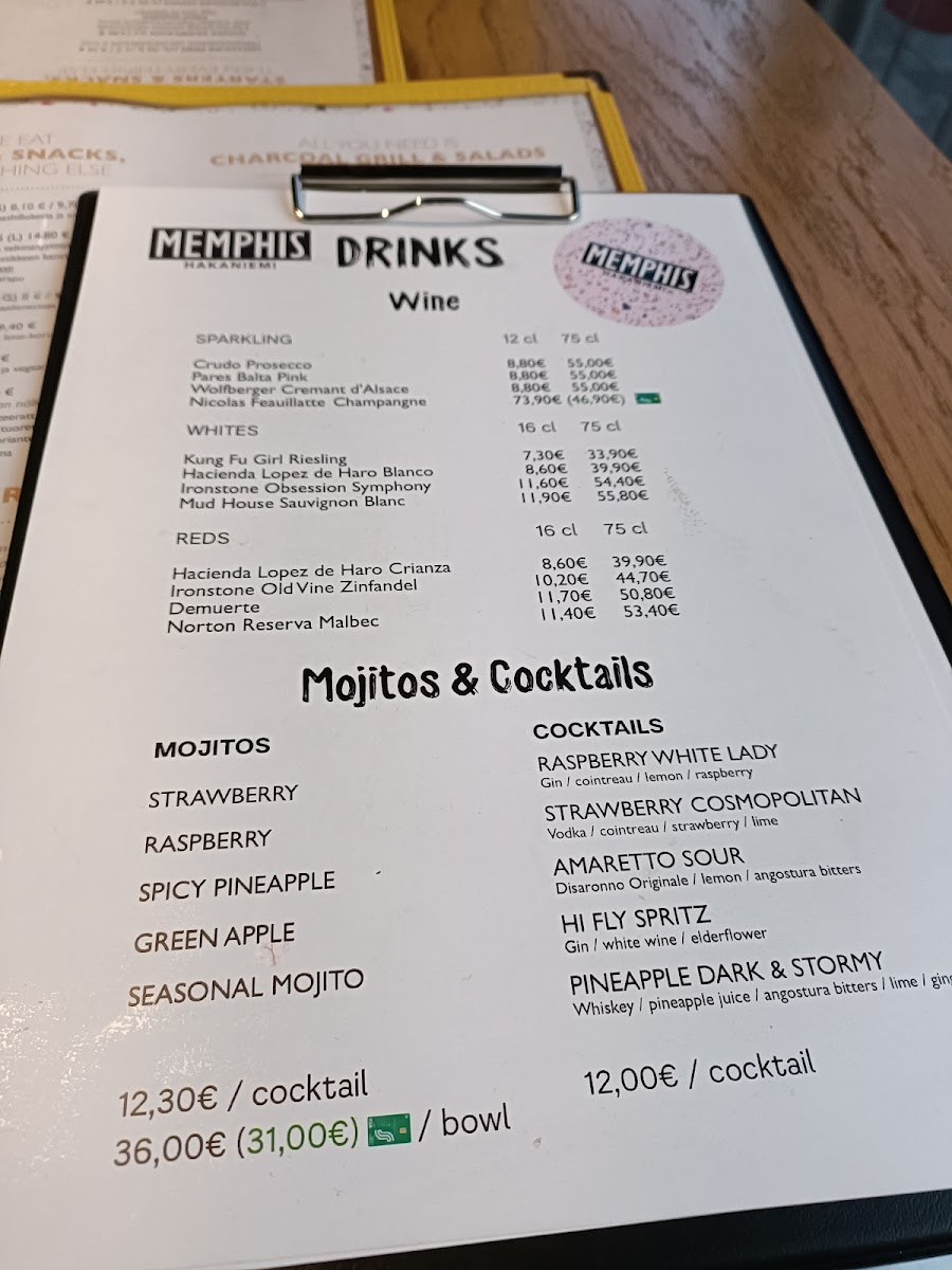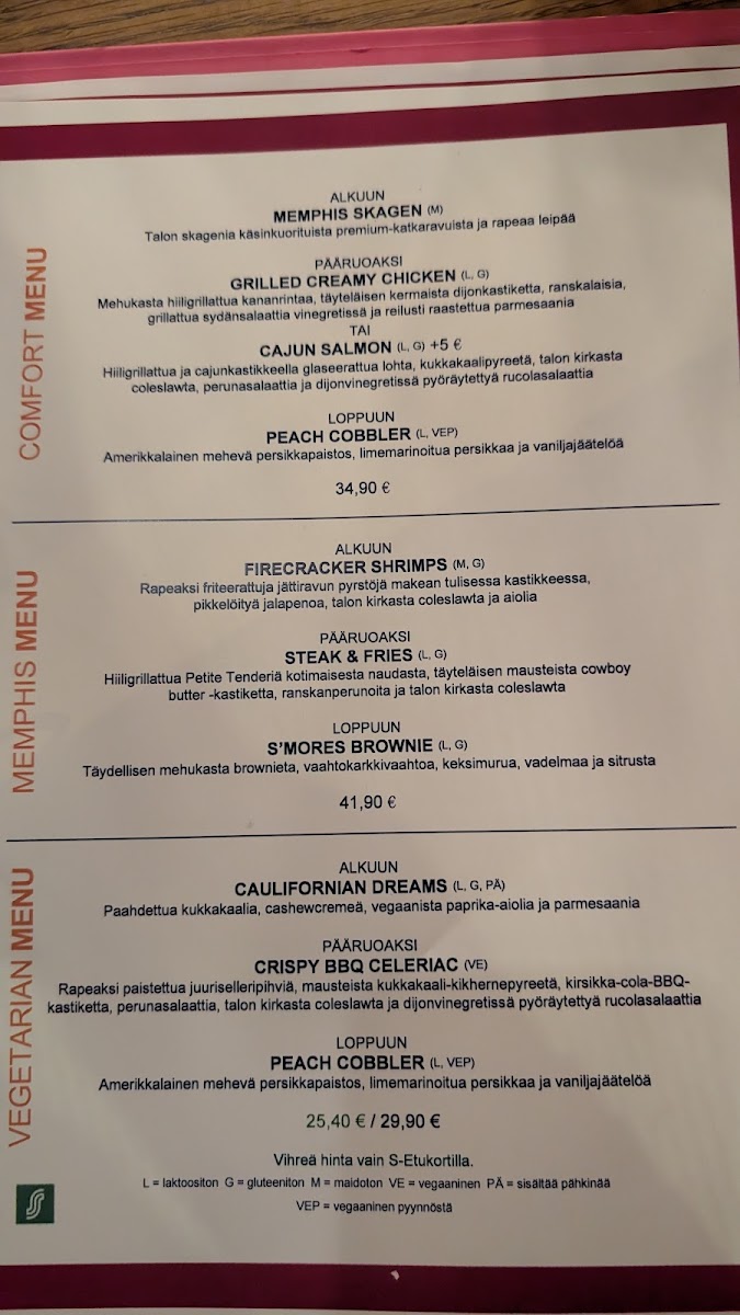 Memphis Hakaniemi offers a diverse and satisfying menu, perfect for a casual yet flavorful dining experience. Starting with appetizers, their The Snack Platter comes in various portions, with options for 4 pieces (€18) or 6 pieces, featuring a delicious assortment of bites. For something lighter, their Halloumi Fries are a popular choice. Moving on to the main courses, the burgers steal the show. The Halloumi Burger is a vegetarian favorite, while the Memphis Burger and Beef & Bacon Sandwich cater to those craving something meatier. If you're looking for something from the grill, the Grilled Creamy Chicken and Cajun Salmon are standout dishes, and for a unique treat, the Barbeque Cheek & Fries is a must-try. For sides, the Filthy Fries, Sweet Potato Fries, and Potato Salad complement any dish perfectly, while Coleslaw and Fries are simple but satisfying options. If you're craving a salad, options like the Katkarapu (shrimp), Kanan Rinta (chicken breast), and Pariloitu Vuohenjuusto Cobb Salad are sure to please. To enhance your meal, choose from a variety of dips like Sinihomejuusto (blue cheese), Dijon-Sinappi (Dijon mustard), and the spicy Cowboybutter-Kastike. For those who love a bit of heat, the Double Jalapeño Smash and Double Oklahoma Smash from the Smash Burger section are exciting choices. The menu offers a perfect balance of flavors, with something for everyone, whether you're in the mood for burgers, grilled meats, or light salads.
